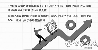据美国劳工部6月10日公布的数据显示,5月份美国消费者价格指数(CPI)环比上涨1%,同比上涨8.6%,同比涨幅创1981年12月份以来最大值。剔除波动较大的食品和能源价格后,核心CPI环比上涨0.6%,同比上涨6%,涨幅均高于市场普遍预期。