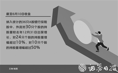 据《证券日报》记者梳理,截至6月10日收盘,纳入统计的36只A股银行保险股中,外资对30只个股的持股量较去年12月31日出现增长,对24只个股的持股量增幅超过10%,对10只个股的持股量增幅超过50%。尤为引人注意的是,外资对青岛银行、中国人保、苏州银行的持股量增幅均超过100%,分别为182.2%、161.3%、102.3%。