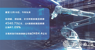 目前,资本市场已经建立起“股债双轮驱动”服务创新发展战略的格局。股权融资方面,据Wind数据统计,截至12月16日,今年以来,科创板、创业板、北交所股权融资规模4540.73亿元,占A股股权融资规模比例41.09%。