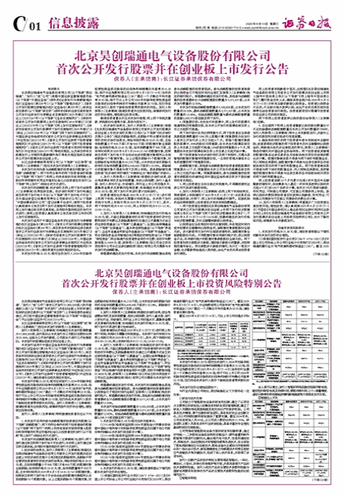 • 北京昊创瑞通电气设备股份有限公司 首次公开发行股票并在创业板上市投资风险特别公告(下转C2版)