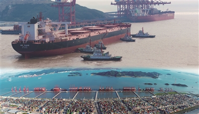 图①宁波舟山港(港口)全球首次同靠接卸两艘40万吨铁矿船 图②宁波舟山港(港口)梅山港区 公司供图