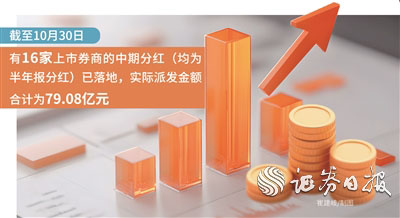 从年内券商中期分红(包括季报、半年报以及特殊分红)情况来看,Wind资讯数据显示,截至10月30日,有16家上市券商的中期分红(均为半年报分红)已落地,实际派发金额合计为79.08亿元。其中,分红金额位居前三的券商分别为国泰海通、招商证券和东方证券,分红金额分别为26.27亿元、10.35亿元、10.12亿元。