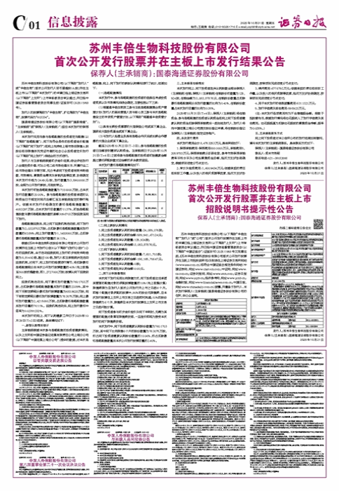 • 苏州丰倍生物科技股份有限公司 首次公开发行股票并在主板上市 招股说明书提示性公告