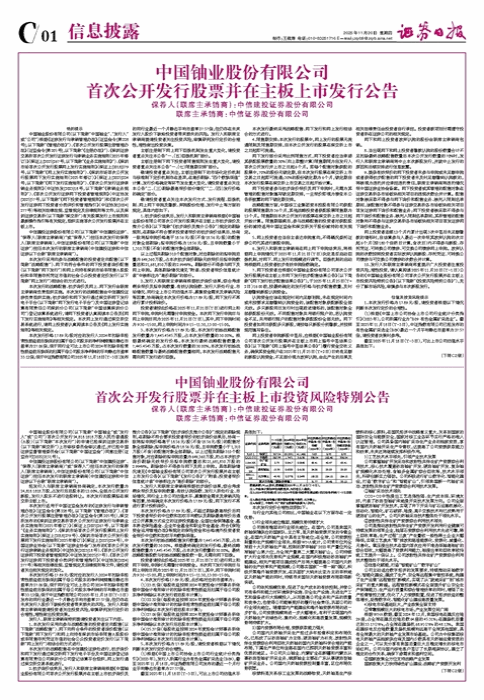• 中国铀业股份有限公司 首次公开发行股票并在主板上市投资风险特别公告(下转C2版)