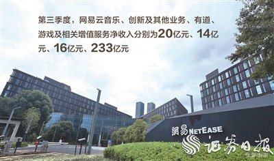 网易第三季度净收入增长主要得益于游戏及相关增值服务业务。第三季度,网易云音乐、创新及其他业务净收入分别为20亿元和14亿元;有道净收入为16亿元,同比增长3.6%;游戏及相关增值服务净收入为233亿元,同比增加11.8%。