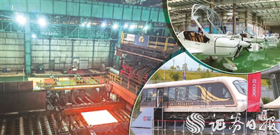 图①湘钢自动转钢系统工作中 图②山河星航机库中的“阿若拉”轻型运动飞机 郭冀川/摄