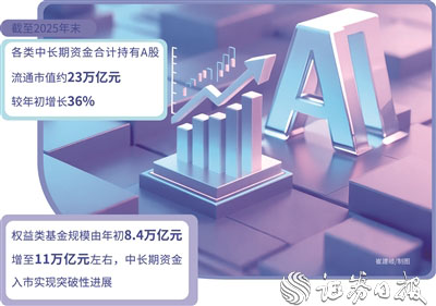 证监会副主席陈华平日前披露,截至2025年末,各类中长期资金合计持有A股流通市值约23万亿元,较年初增长36%;权益类基金规模由年初8.4万亿元增至11万亿元左右,中长期资金入市实现突破性进展。