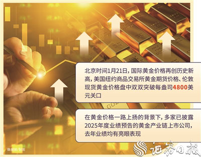 2026年以来,国际黄金价格延续了2025年的强劲走势。北京时间1月21日,国际黄金价格再创历史新高,美国纽约商品交易所黄金期货价格、伦敦现货黄金价格盘中双双突破每盎司4800美元关口。同日,国内部分品牌金饰报价突破1500元。