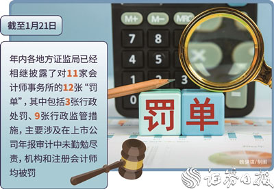 今年年初,中国证监会召开资本市场财务造假综合惩防体系跨部门工作推进座谈会时提出,强化对中介机构的责任追究。截至1月21日,年内各地方证监局已经相继披露了对11家会计师事务所的12张“罚单”,其中包括3张行政处罚、9张行政监管措施,主要涉及在上市公司年报审计中未勤勉尽责,机构和注册会计师均被罚。