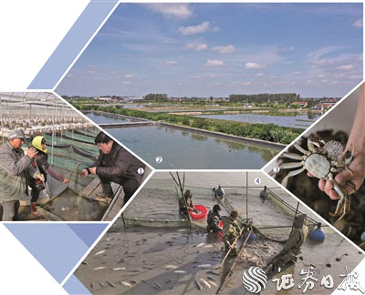 图①科技人员指导养殖户开展小龙虾大棚提早繁育试验 图②兴化市海南镇标准化河蟹养殖池塘