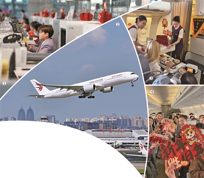 图④中国东航客舱服务人员与乘客共同庆祝新年
