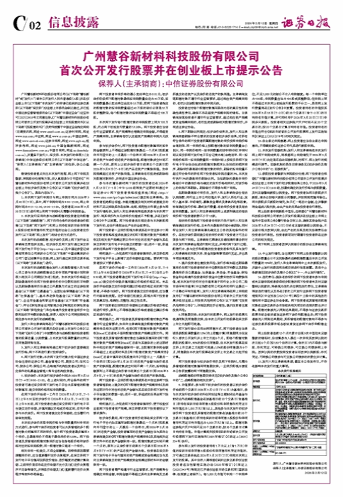 • 广州慧谷新材料科技股份有限公司 首次公开发行股票并在创业板上市提示公告