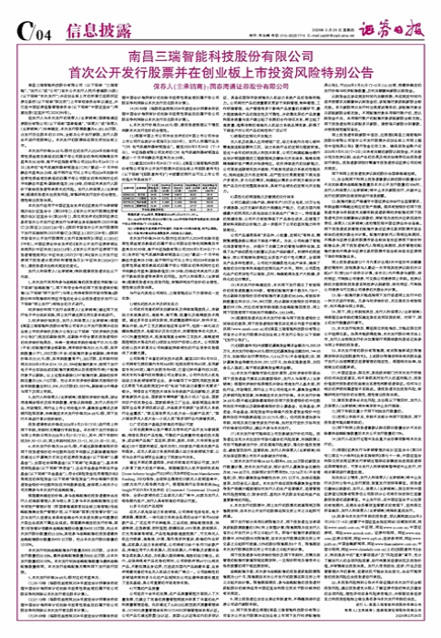 • 南昌三瑞智能科技股份有限公司 首次公开发行股票并在创业板上市投资风险特别公告