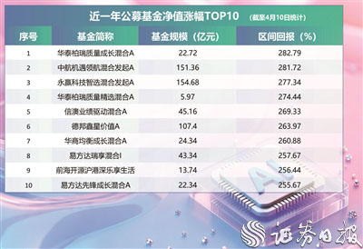 数据显示,截至4月10日,华泰柏瑞质量成长混合A近一年净值增长率为282.79%,为全市场近一年业绩表现最佳的权益类基金;中航机遇领航混合发起A、永赢科技智选混合发起A、华泰柏瑞质量精选混合A、信澳业绩驱动混合A等21只产品期间净值增长率也均超200%。